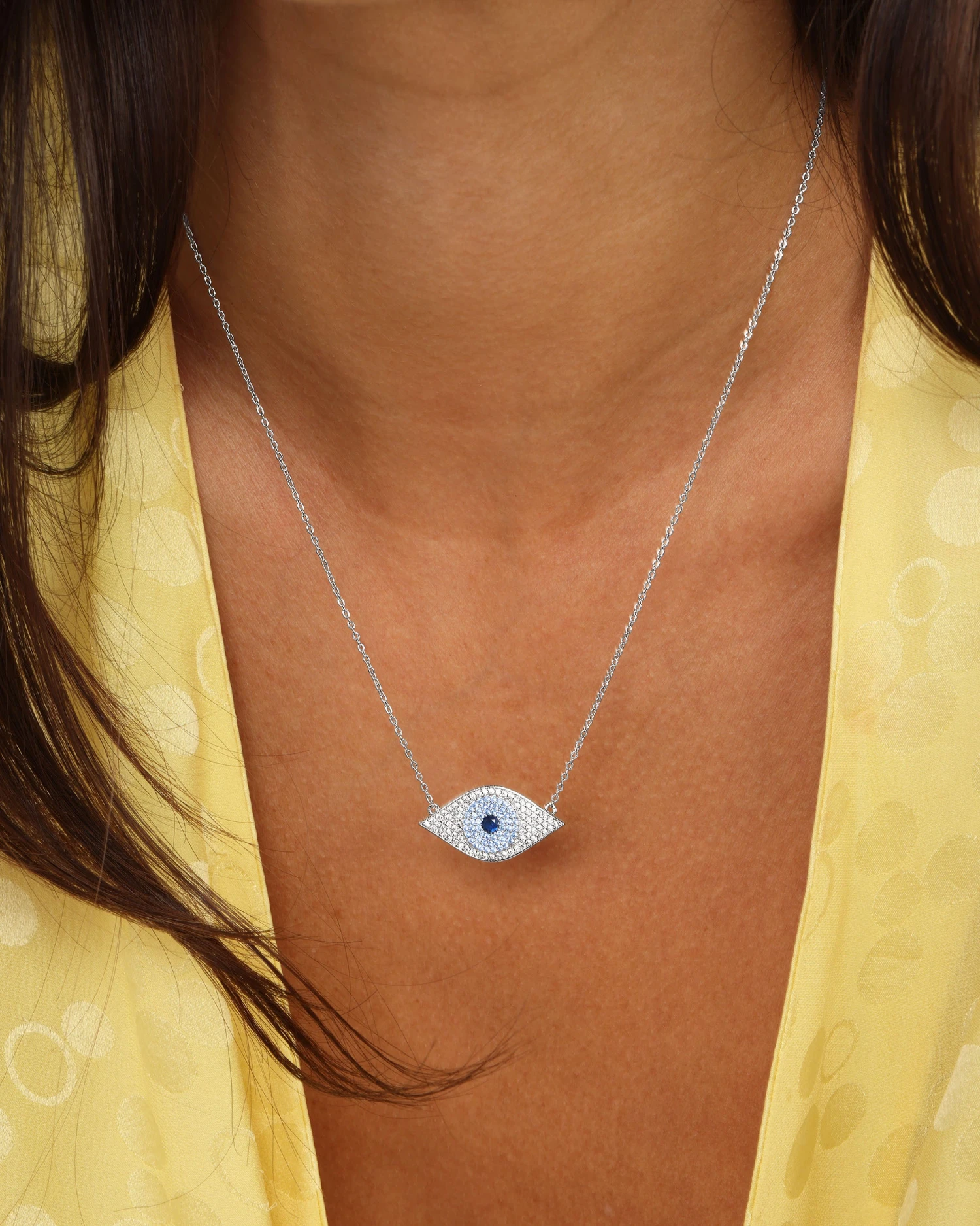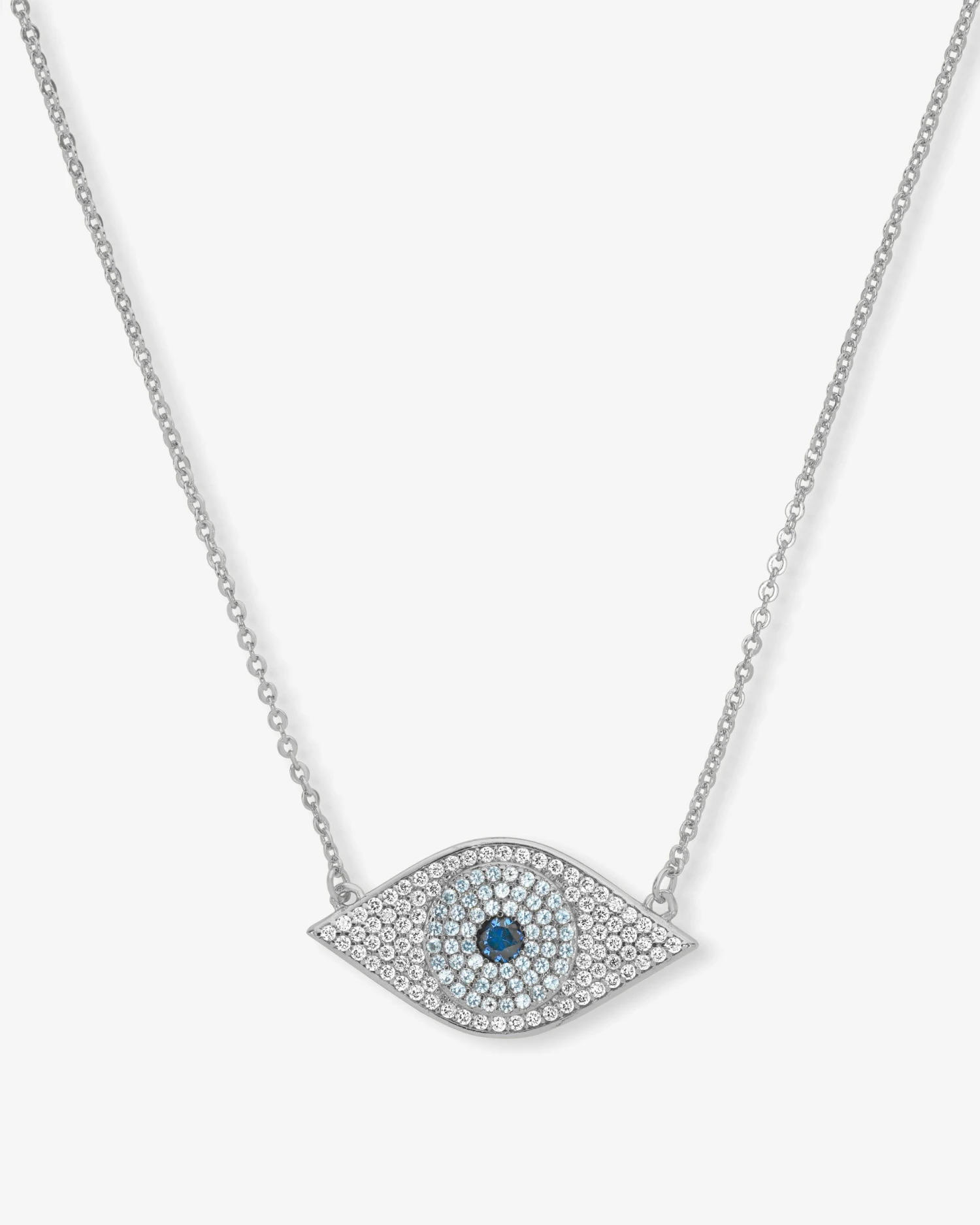Good Vibes Only! Get your daily dose of protection, strength, and courage with our Blue Evil Eye Necklace. This striking piece features a simulated white pavé diamond eye with a light blue simulated pavé diamond iris and a simulated sapphire pupil, designed to ward off envy. Wear it alone or layer it with other necklaces for a chic, modern way to tell your story.