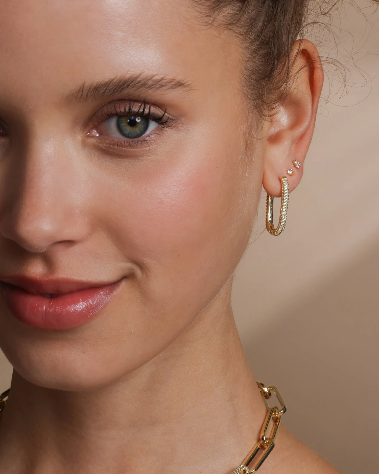 Our best selling Carrie Chain now has a sequel. Just as versatile as your favorite chain, the Carrie Pavé Chain Huggie’s U-shape is the new shape your ear stack NEEDS.