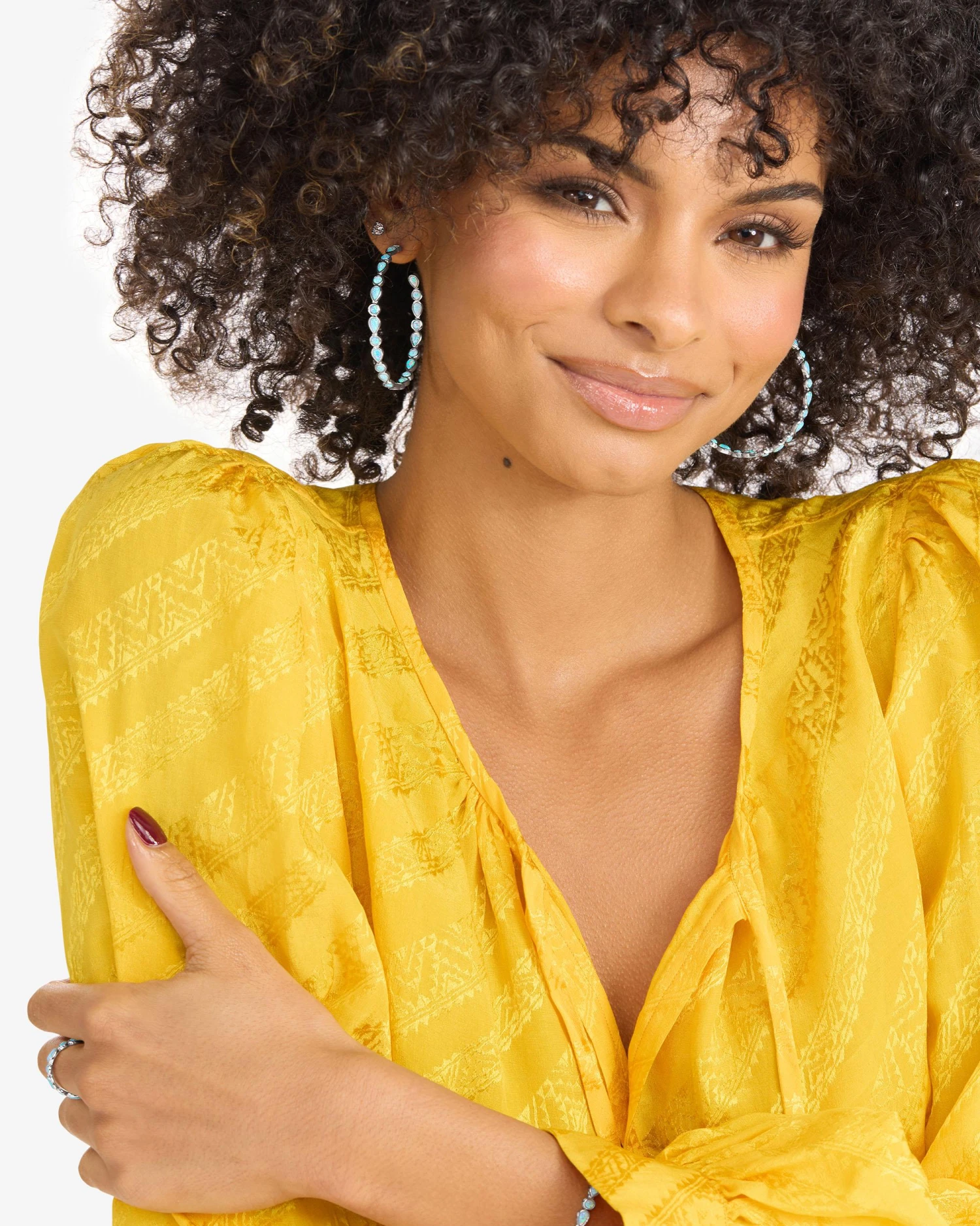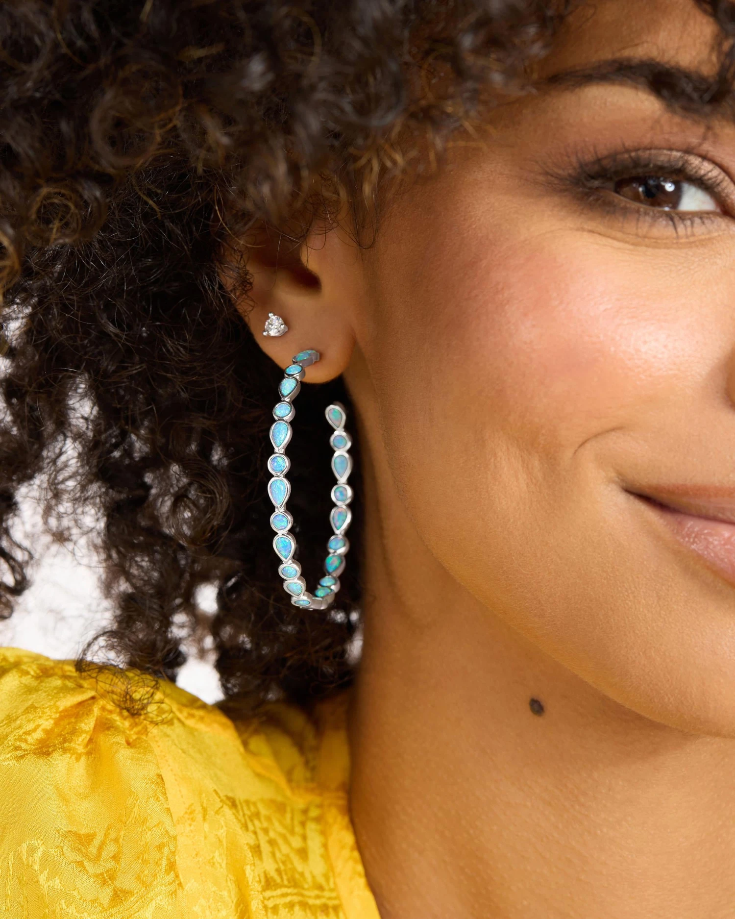 Our best-selling hoop is BACK and better than ever! These unique hoops feature simulated opals that alternate between unique mosaic shapes. A crowd favorite!