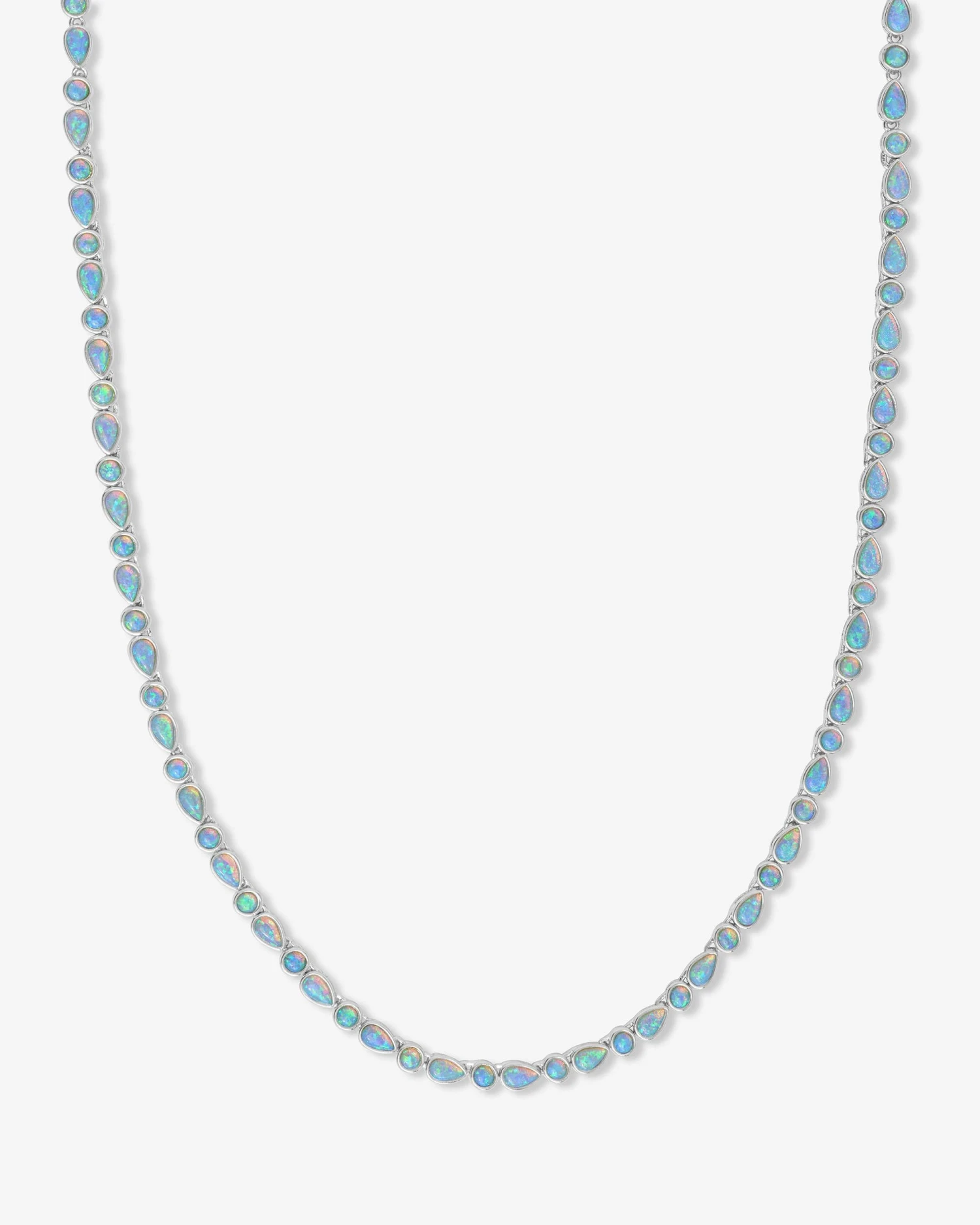 Vacation mode: on. A classic tennis necklace with effortless simulated blue opal shine. Wear it solo or stack it up, no packing stress required.
