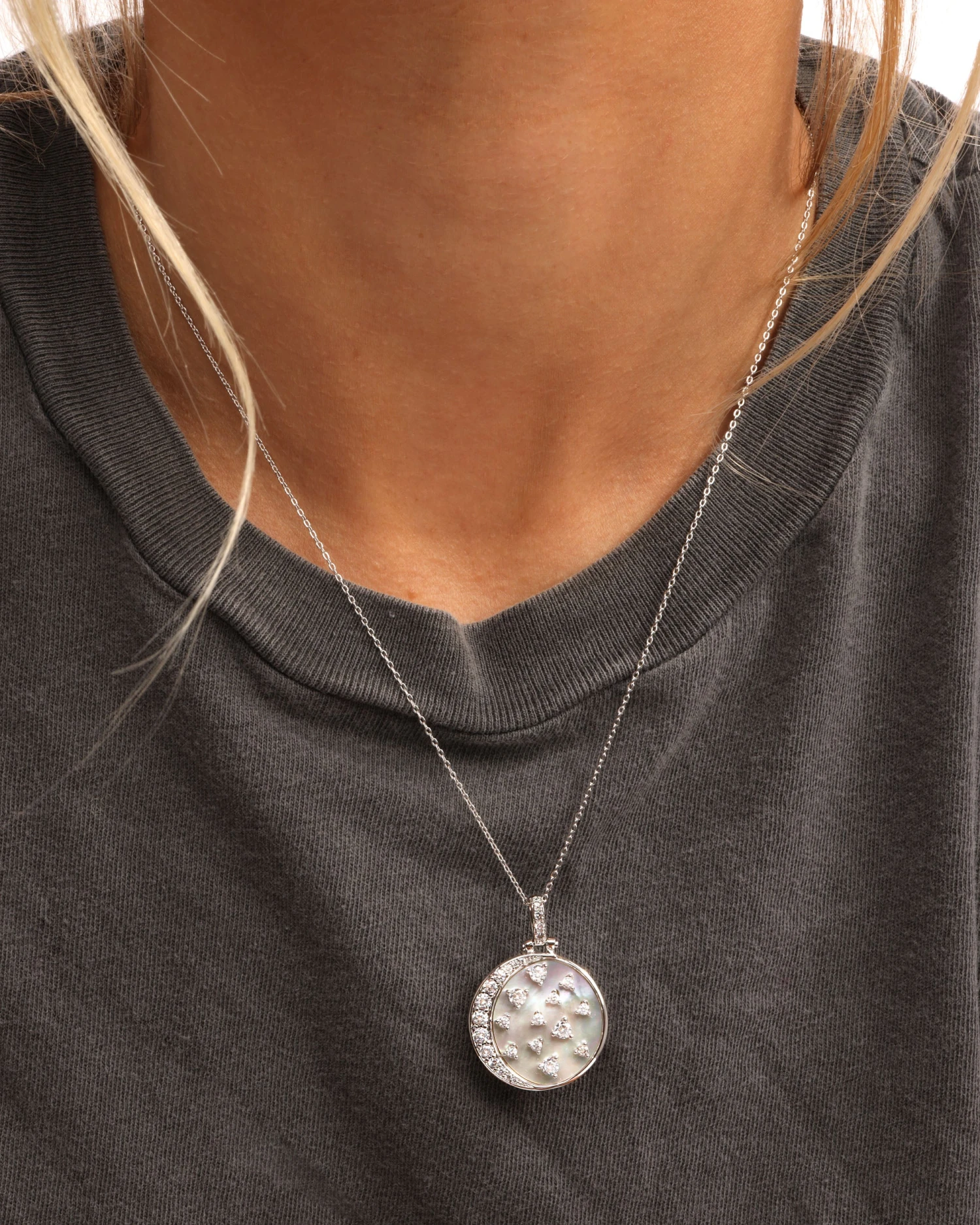 Sweet Dreams are made at Melinda Maria! We love the dreamy look of this intricately designed mother of pearl pendant necklace. Adding a pavé moon and stars helps to make your dreams even sweeter. It’s the perfect style to layer with your other favorite MM pieces.